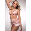 Forever a hopeless romantic, meet our curve-hugging silhouette mini skirt. This sultry-sweet skirt is dressed up in dreamy sheer lace, delicate decorative straps, silky mesh with cool cutout in the front and criss cross cutout on the sides. Matching bra delightedly opens in the front with peekaboo criss cross cutout. Matching thong included.