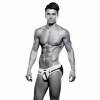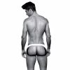 Created in white with popping accents of black, this brief is cut higher along the hips, features a low-rise waist, and has an open back complete with black jockstrapping.
