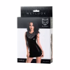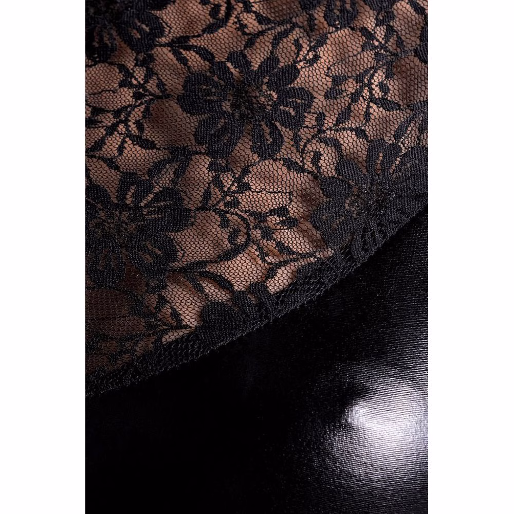 A shiny black dress made of Wetlook material with lace inserts. It fits the silhouette sexually, and floral black lace in the neckline and on the back adds sexy accents to the image.