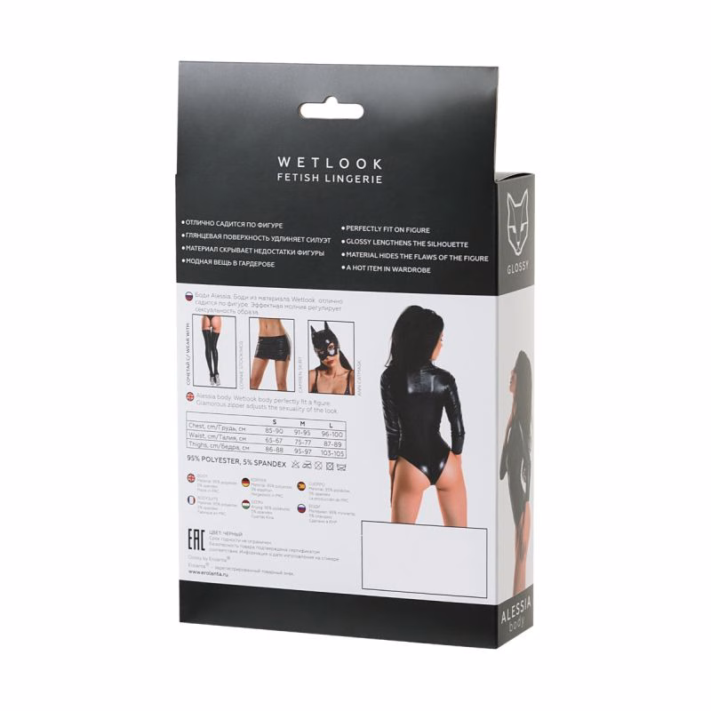 The sexy Glossy Alessia Wetlook Bodysuit w Zip made from 95% polyester and 5% spandex perfectly fits your figure and can decorate your evening look in combination with trousers or a skirt. This bodysuit has a metal zipper in the front and blue metal false pockets.